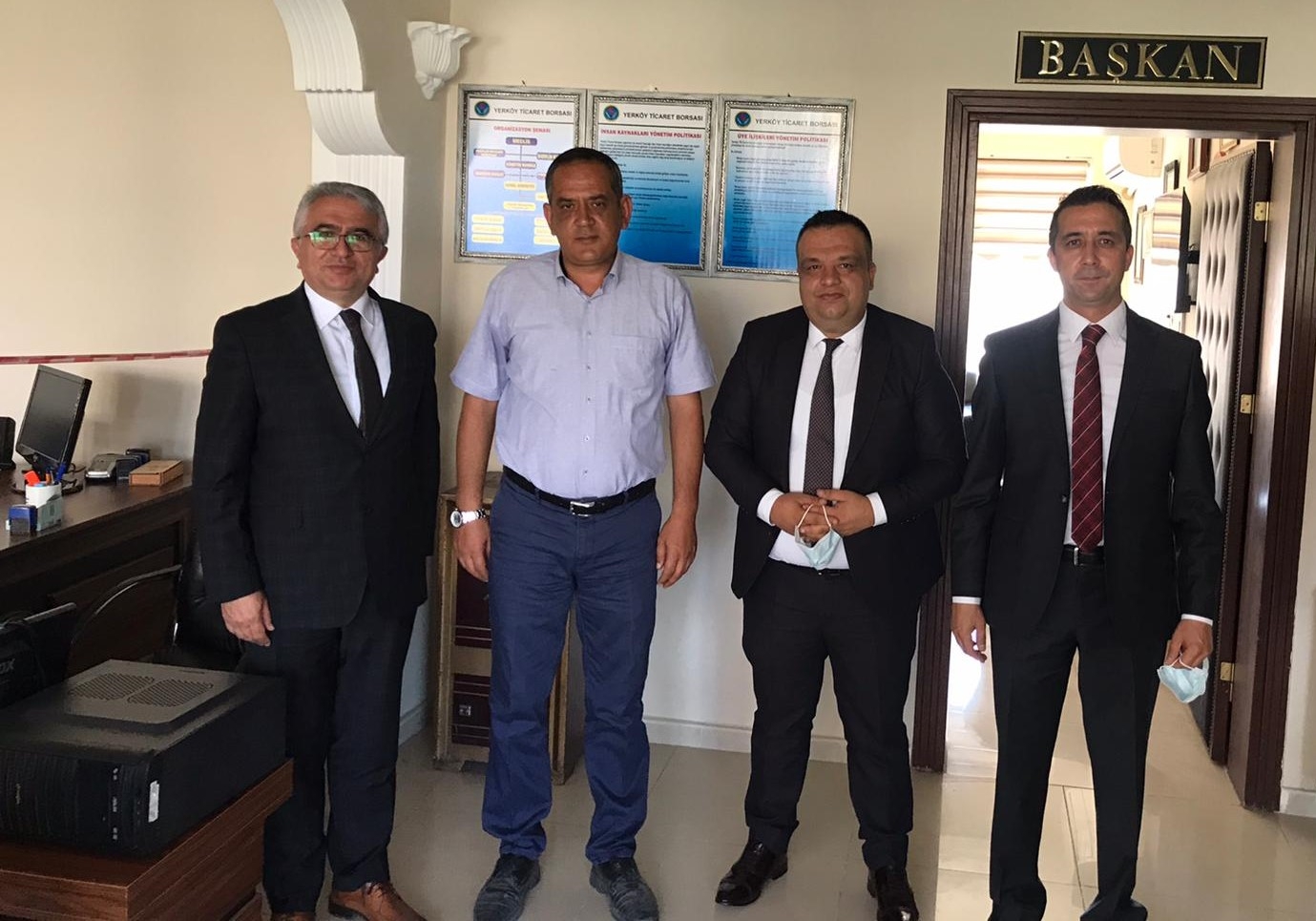 T.C Ziraat Bankası Aksaray Bölge Başkanı Mesut ALKAN, Bölge Pazarlama Müdürü Osman AKBULUT ve Ziraat Bankası Yerköy Şube Müdürü Hilmi ESASLAN, Yerköy Ticaret Borsasını ziyaret ederek Yönetim Kurulu Başkanı Derviş ESATBEYOĞLU ile makamında görüştüler.